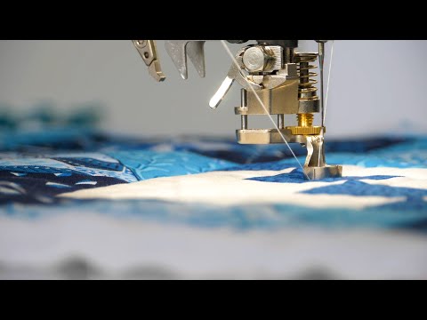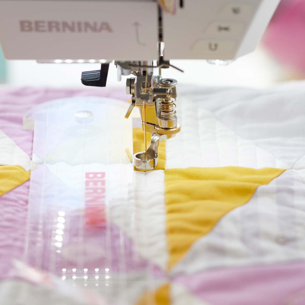 With this technique, the feed dogs are lowered, and the fabric and a Plexiglass template are guided manually, with the base of the foot resting against the ruler's edge. You can adjust the height of the foot to match the fabric thickness individually so that the fabric can be moved smoothly and without getting stuck.