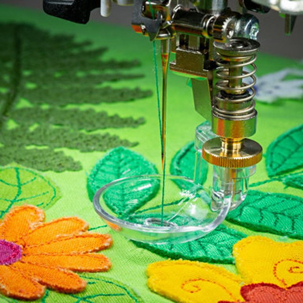 Quilting around raised or dimensional elements of your quilt is easier than ever with the help of the Adjustable Gliding Cup Foot #74. Smoothly glide over lifted or uneven edges of embellishments and appliqués. The transparent cup allows for clear sightlines to the needle and fabric giving you more control over the creative process.