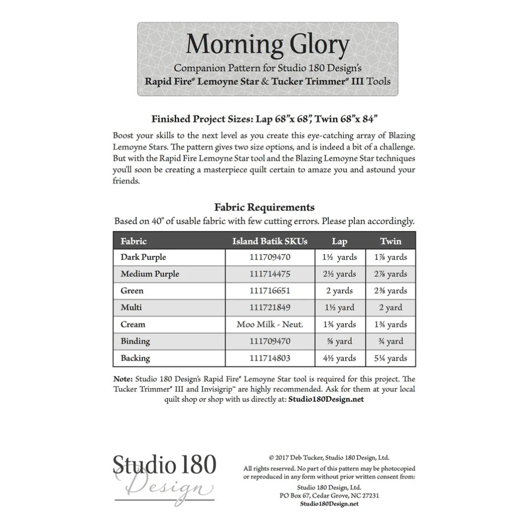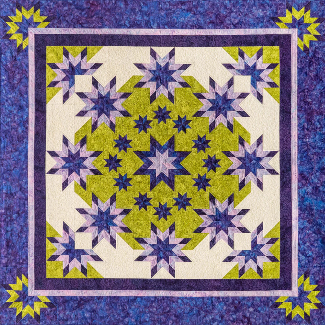 The Studio 180 Morning Glory pattern showcases stunning Blazing Lemoyne Stars in a design that's both striking and achievable. This pattern brings together rich purples, fresh greens, and carefully chosen focus fabrics to create a quilt that commands attention whilst remaining beautifully balanced.