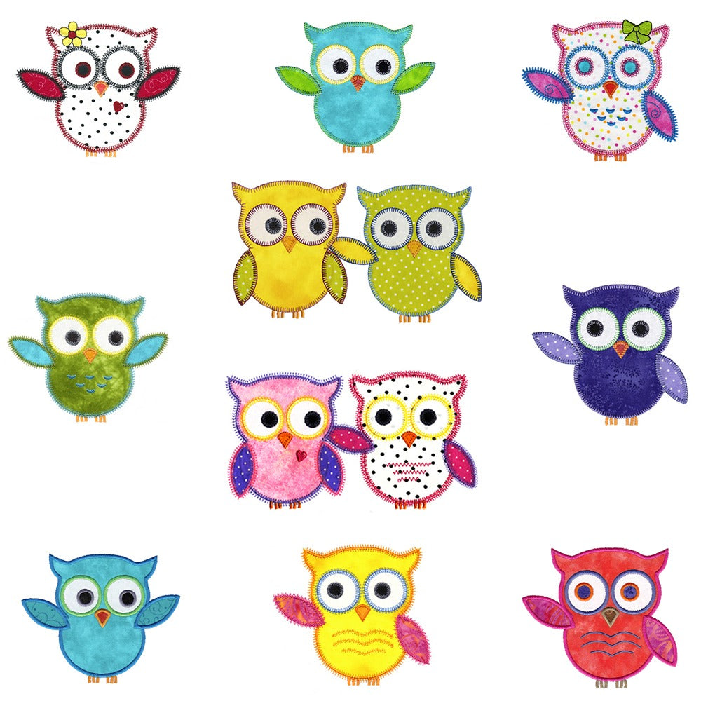 You get 10 designs in this set. There are 8 designs with a single owl and 2 designs with a pair of owls. You can choose from a variety of applique edge finishes.