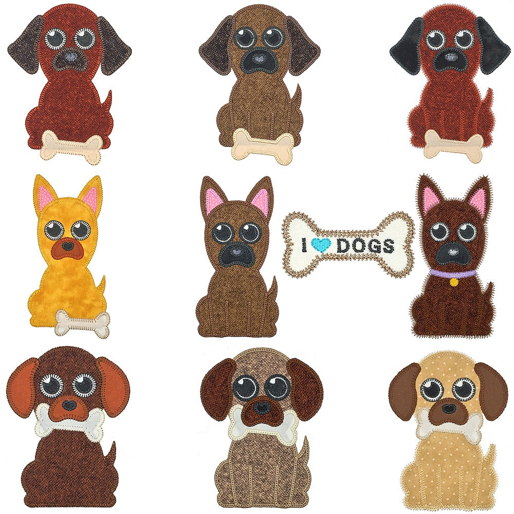10 designs in this set. 3 different dogs to choose from. Each dog has a blanket stitch, a satin stitch and a decorative motif applique edge. You also get a cute bone design.