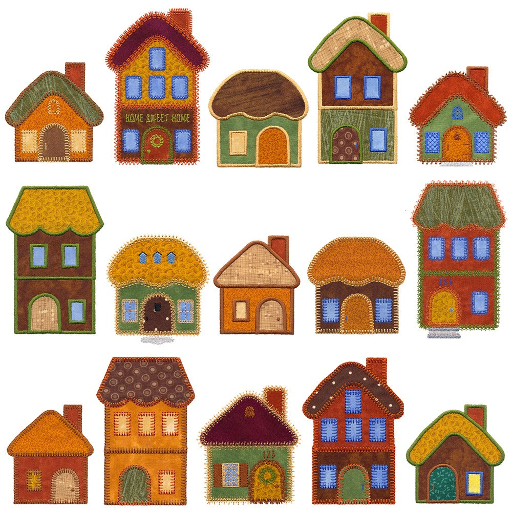 15 designs are included in this set. There are short houses and tall houses. All of the houses have a variety of applique edges and embellishments