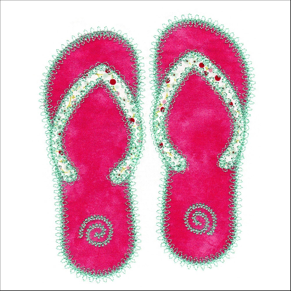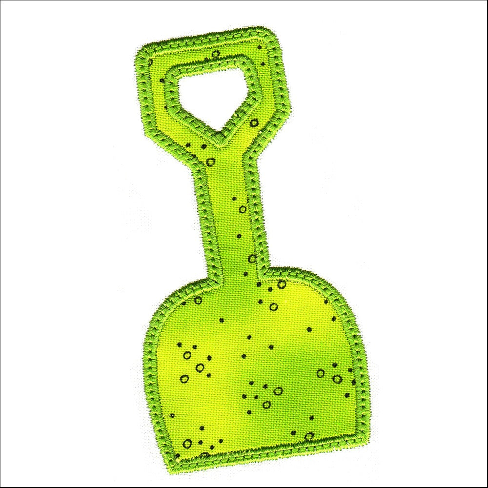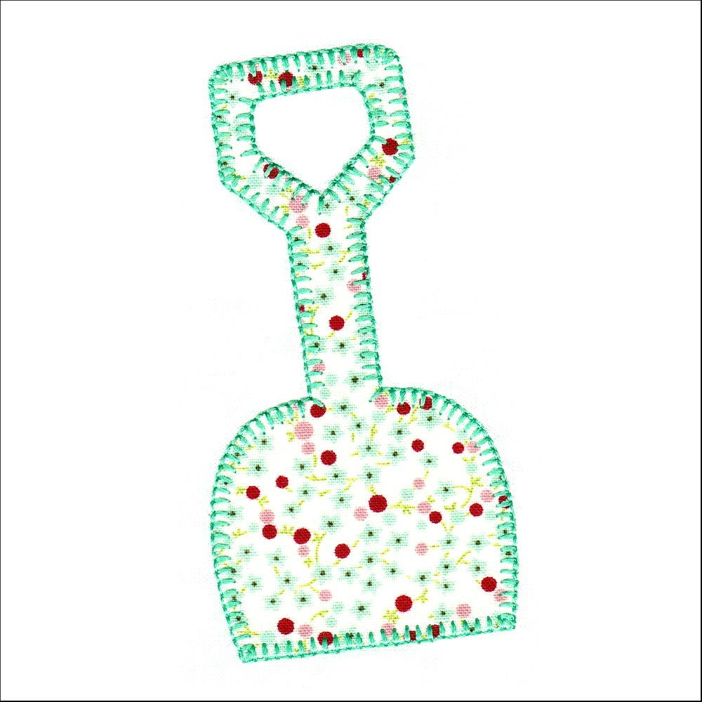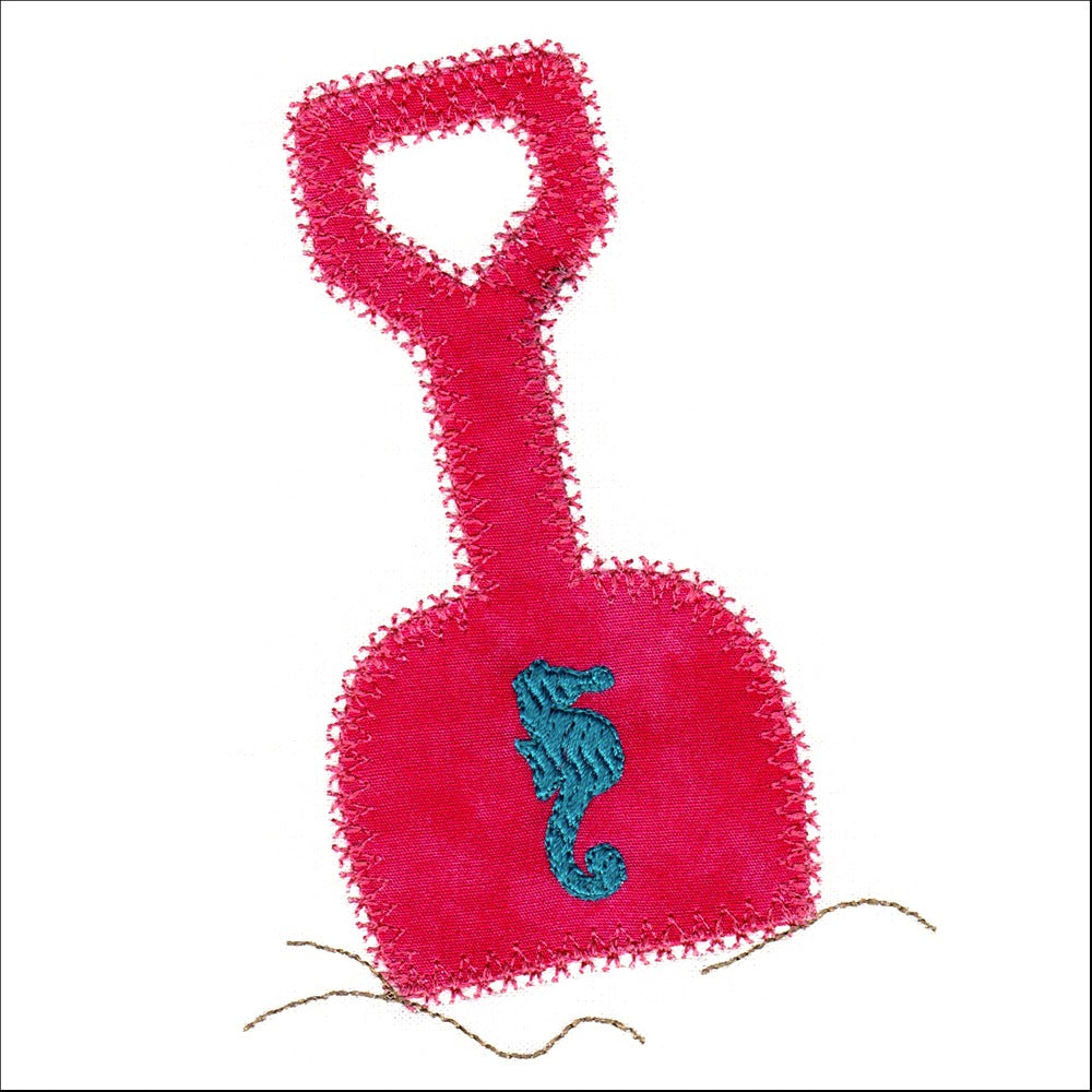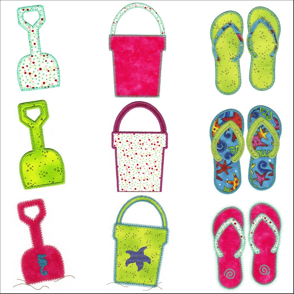 9 designs included in this set. You get a shovel, a bucket and flip flops. All 3 items have 3 different outlines to choose from. There is a blanket stitch, a satin stitch and a decorative motif stitch.
