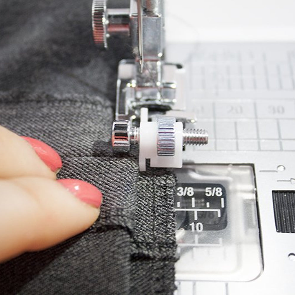 This foot is most suitable to sew blind hems or to topstitch edges. The stitches only pierce the hem so that the stitch holes are hardly visible on the right side of the fabric.