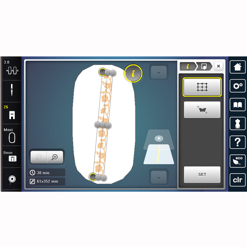 Extra-large 7" colour touch screen; Embroidery area of 400mm x 210 mm The extra-large touchscreen makes operating the machine easy. Get direct tips and tricks or have short, built-in tutorials show you the necessary work steps. For each embroidery technique, Creative Consultant Embroidery helps you choose the correct foot, needle, thread, and stabiliser for your fabric to achieve the best results.