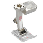 Reverse-pattern foot with clear sole #34 affords a clear view of the needle and stitching area. The red markings on the top of the presser foot allow for especially precise and careful sewing.