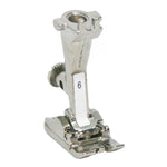 Embroidery foot #6 is ideal for satin stitching and other dense stitch patterns. The wide channel under the sole allows it to glide effortlessly over thicker and wider stitch formations without fabric feed being affected.
