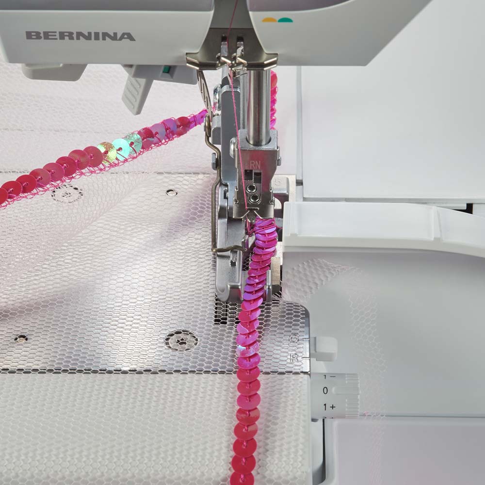 With the Beading and sequin foot, you can sew strings of beads and sequins up to a maximum diameter of 6mm (¼") easily and quickly to your project.