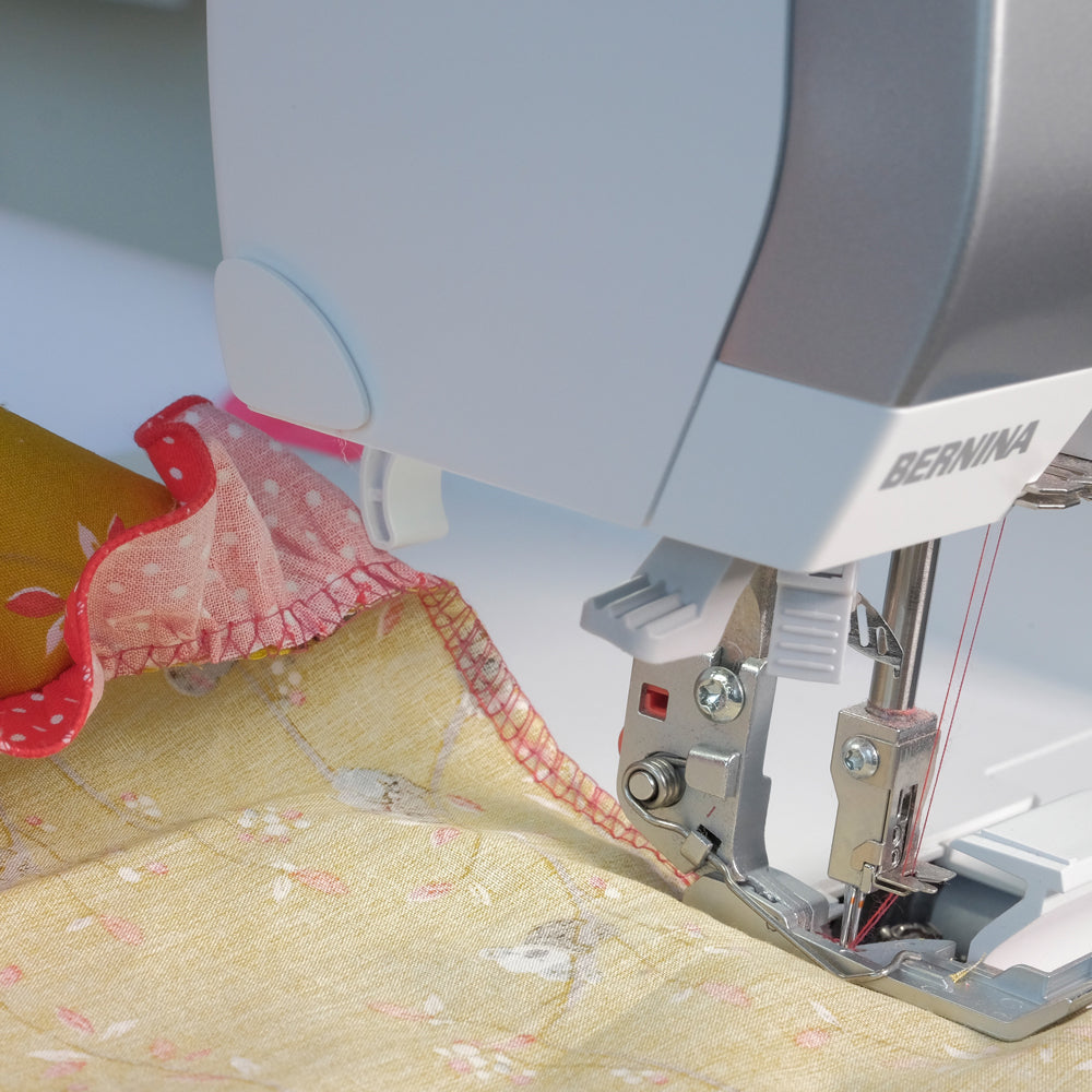 By pressing the foot control with your heel, you can easily raise or lower the needle by a half stitch. The BERNINA Free Hand System (FHS) lets you raise and lower the presser foot with your knee, leaving both your hands free to guide the fabric.