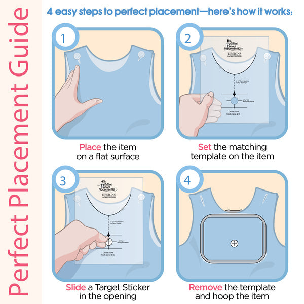 Perfect placement is the key to successful embroidery. With the Children's Perfect Placement Kit, it's easy to achieve the perfect placement of designs on children's items. No more guesswork, rework or hassle.