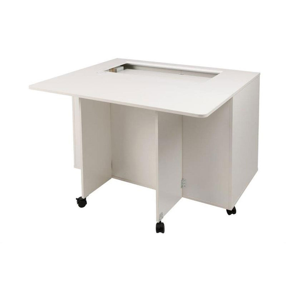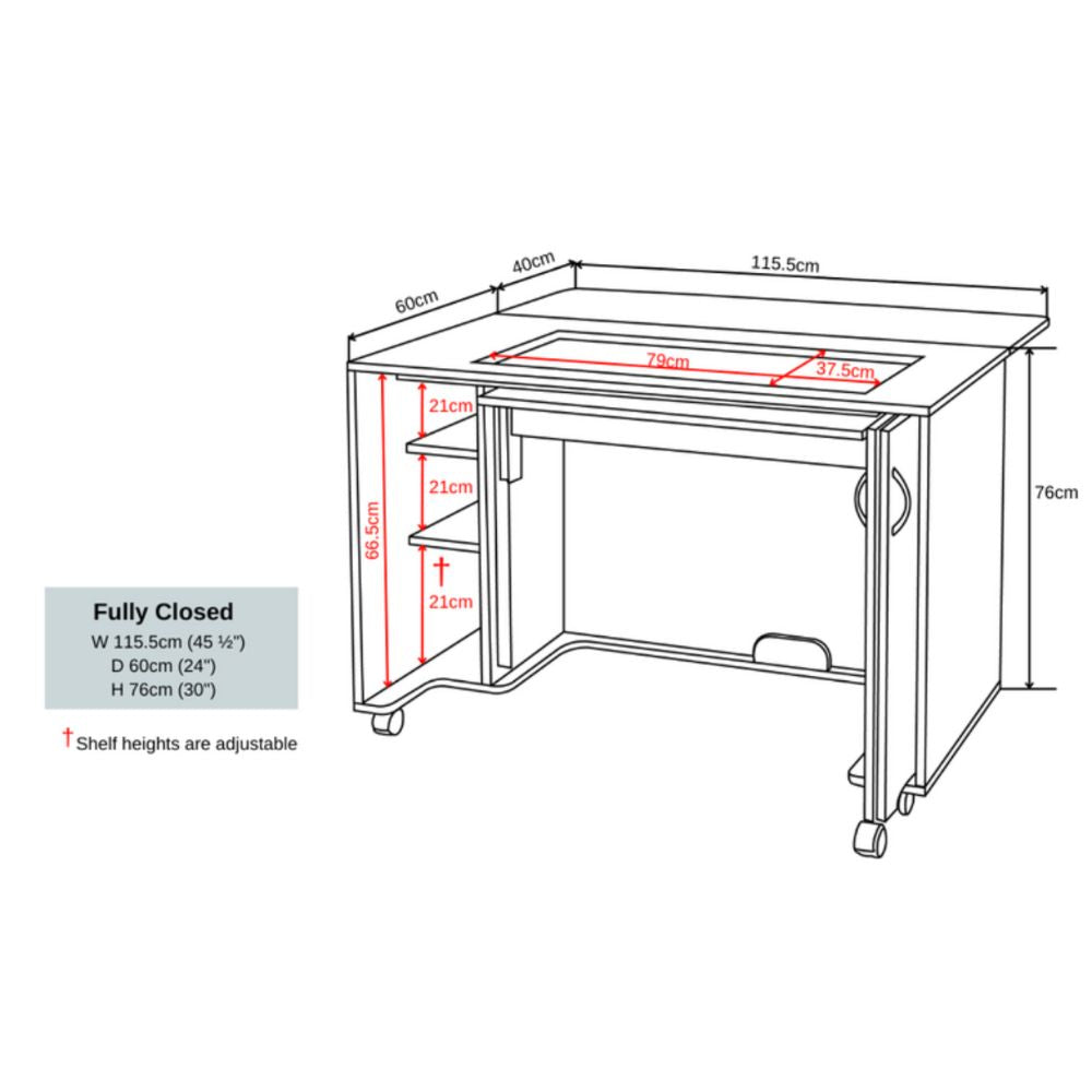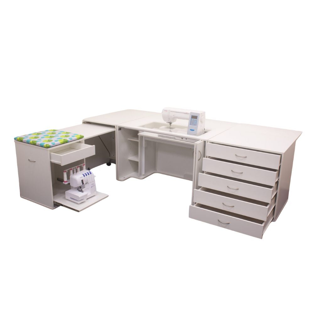 Compact enough when closed to fit in most rooms with storage for two machines but opens up to provide a workspace big enough for any serious quilter or sewer. There is a back work area as well as a drawer and door storage.
