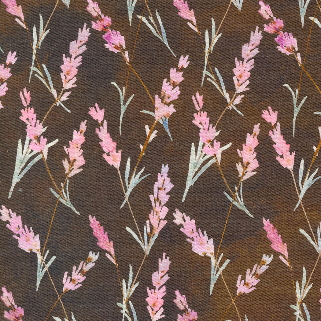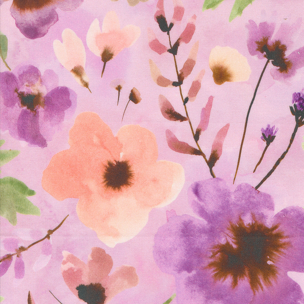 called Muffin? Every time I see Muffin (who wears a very fetching lilac collar) in the park when we’re walking our dog Wilson, I notice how lovely the lilac and chocolate brown colour combination is. So I sat down to draw with my sepia ink and lilac watercolours and started painting and playing. Before long, I had pages and pages of floral watercolour paintings to send to Moda. Blooming Lovely is filled with fresh, pretty