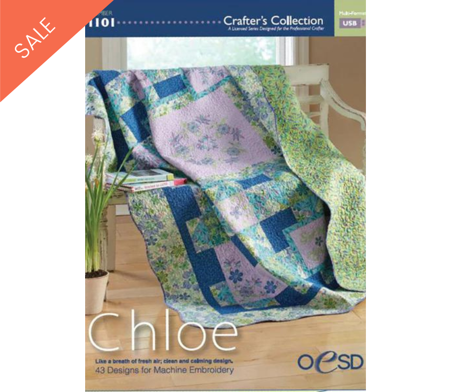 OESD Premier Collection of 43 vibrant, trendy designs shown here in today's hottest colours. Large, full flowers burst into bloom, vines sway in the breeze, and radiant paisleys all converge to bring Chloe to life. Chloe has all you need to create ultra-chic projects, from contemporary quilts to fashion accessories to home decor projects.