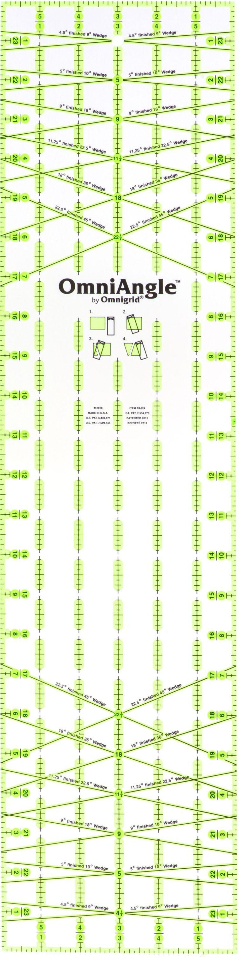 The 6” x 24” OmniAngle non-slip wedge ruler has angle markings to create 9, 10, 18, 22½", 36 and 45 wedges – it makes complex angle cutting easy; use it to create fans, circles, half and quarter circles, wedges and spirals; it can also be used for strip cutting.